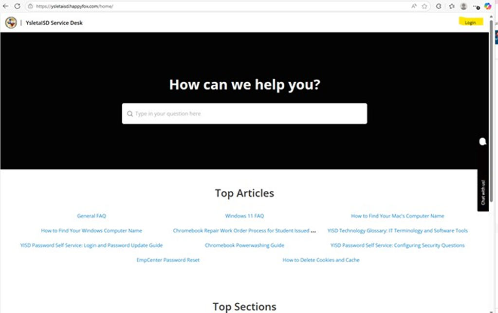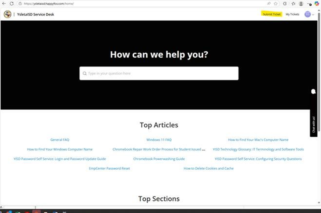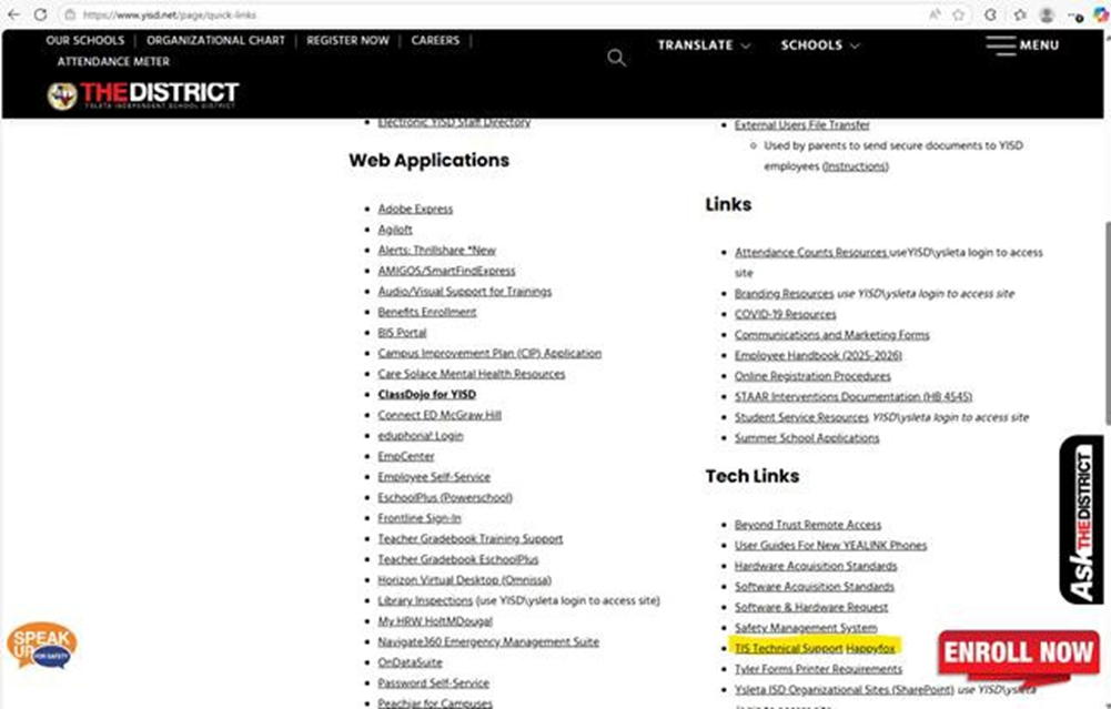 - You can also access this site from the YISD Quick Links under Tech Links → TIS Technical Support (HappyFox).