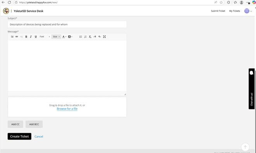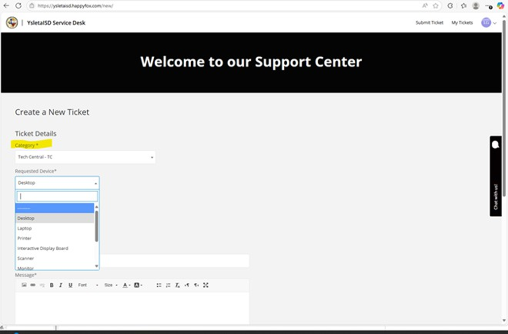 HappyFox is Ysleta ISD’s online platform for submitting IT support requests. Staff can log in, choose a category like Tech Central, describe their issue or request, and submit a ticket for review by the Service Desk team.